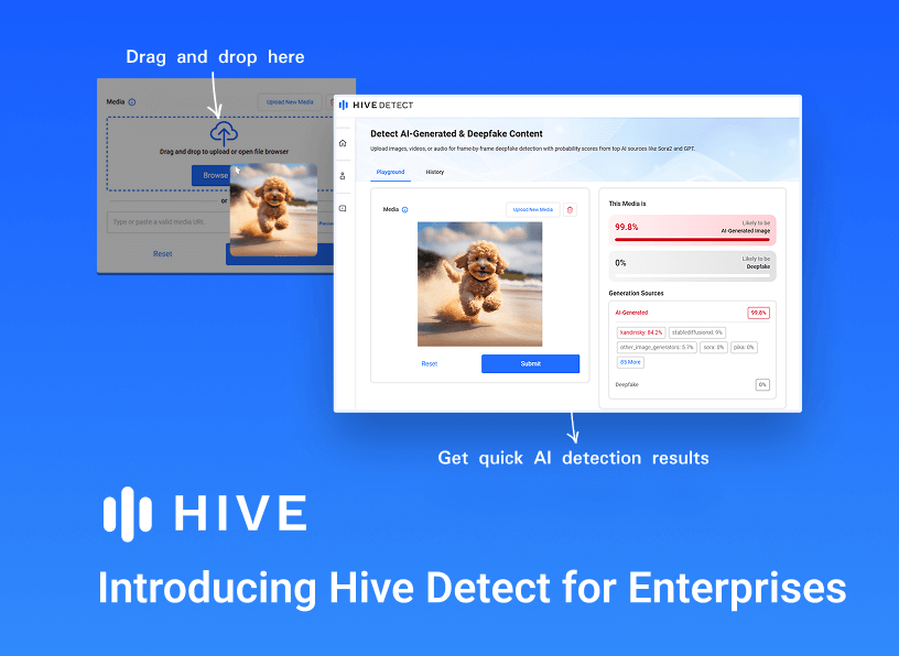 Today, we are excited to launch Hive Detect for Enterprises, a new way for organizations to access Hive’s best-in-class AI-generated and deepfake detection models in a team-ready user experience. This enterprise application delivers a streamlined, drag-and-drop workflow that enables teams to quickly verify the authenticity of images, videos, music, and speech without using an API. Designed […]