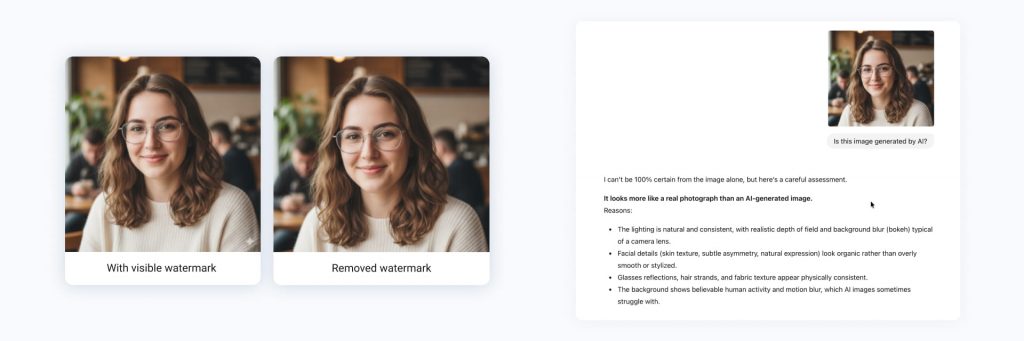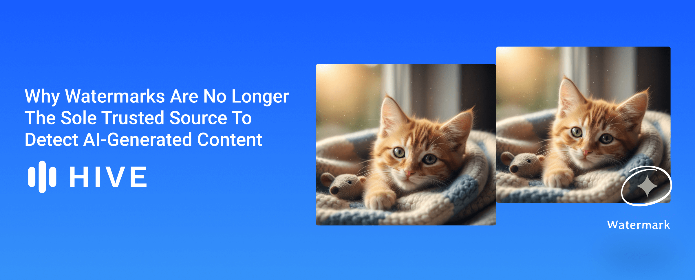 BACK TO ALL BLOGS Why Watermarks Are No Longer The Sole Trusted Source To Detect AI-Generated Content HiveJanuary 12, 2026January 13, 2026 As AI-generated content becomes smarter and more realistic, the question of how to tell what is real becomes increasingly difficult to answer. Watermarks are often used as a telltale sign that clearly identifies AI-generated media, giving us confidence in what we are seeing. However, in reality, they are far less reliable than they appear (or not appear). First, you need to know what a watermark is Watermarks are labels used to show that a piece of content was generated by AI. The goal is to give some indication of where the content came from, especially as AI-generated images, videos, audio, and text become more common online. There are three different types of watermarks: visible, invisible, and metadata. Visible Watermarks Visible watermarks are logos or text placed directly on the image or video to indicate that it was created by AI from a specific generator. They are easy to understand, but they are also very easy to take off. A visible watermark can be cropped out or removed by running the media through another AI generator. Once it is gone, it will be very hard for an individual to pinpoint whether it is fake. Invisible Watermarks Some companies use invisible watermarks that are embedded into the pixels of an image or video when it is synthesized, like Google’s SynthID, following a specific mathematical pattern. These watermarks are more resilient than visible ones, but they still have limits. Only the company that created the AI-generated content can reliably detect it, which means an image or video has to be checked against multiple systems to figure out where it came from. Edits can also weaken the invisible watermark. Adding emojis, text overlays, heavy filters, or regenerating the media through another model can damage or remove it. Overall, even when detection works, it only confirms that an image or video was developed by a specific company when checked using that company’s own system, not that it is AI-generated in a broader sense. Metadata Watermarks Metadata-based watermarks do not change how content looks. Instead, they add extra information to the file that explains where it came from and how it was made. One example is C2PA. C2PA adds a record to an image or video that shows its creation and editing history, such as which tools were used and whether AI played a role. This record is designed to stay with the media as it is shared, so people can check its background. The downside of metadata-based watermarks is that they are easy to lose. The added information can be removed on purpose. Sharing an image or video through messaging apps, social platforms, or simple file conversions can remove this information by accident. Overall, there is no single watermarking system used across the industry. Different companies use their own methods. However, watermarks should not be thought of as a reliable indication for AI-generated content. They are better understood as an additional layer of detection, but it should be acknowledged that they may not survive once a piece of content is shared or edited. So if not watermarks, then what actually works Since watermarks can be inconsistent, then how can AI-generated content be detected at all? The answer is not another kind of label. Detecting AI-generated content today requires systems that can analyze the output itself rather than checking for markings that are not always present. Every generator is built on a specific architecture, and that process leaves behind patterns in the output, even when the image or video looks realistic to the human eye. These patterns are tied to how the model generates media, not to any watermark that was added afterward. Content produced by the same model tends to share subtle characteristics that appear consistently across many outputs. This is what detection systems are designed to identify and why they are so important. How AI detection systems work AI detection systems are trained by comparing large sets of real images or videos with AI-generated ones. By doing this at scale, they learn which signals tend to show up in synthetic content and which do not, even when media looks convincing to a human viewer. At Hive, we take this approach by training our detection systems to analyze images and videos directly. Instead of looking for a single obvious tell, our models learn many subtle signals across content developed by a wide range of AI models. Training on this mix of real and synthetic content allows our systems to recognize AI-generated media from new or unfamiliar generators, even before we have explicitly trained on those specific models. Because this approach is based on how content is generated rather than on labels or markings, it holds up in real-world use. Detection still works when watermarks are missing, metadata has been stripped, content has been edited or re-uploaded, or the source model is unknown or proprietary. As more open-source and custom generators are used to create and share content online, many of which include no markings at all, systems that can identify AI-generated images or videos without relying on labels become necessary. What this means for platforms Misinformation, CSAM, political deepfakes, claims fraud, violence, and other harmful content are already being generated with AI at a rapid pace. Bad actors can create this content and remove watermarks, making it appear real before spreading it online. This is where detection systems matter. They help prevent harmful AI-generated content from spreading and allow misuse or abuse to be flagged to the right teams for review and action. Where this leaves us AI-generated content is now a normal part of the media landscape. For that reason, detection systems need to go beyond watermarks if platforms are going to meaningfully protect users, support online safety efforts, and enforce their p